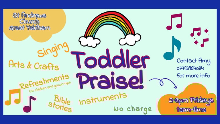 Midweek activities for pre-school children include 'Toddler Praise' which meets weekly during term time at St Andrew's Church, Great Yeldham, 2-3pm. Contact Amy on 07793-964 084 for more info.